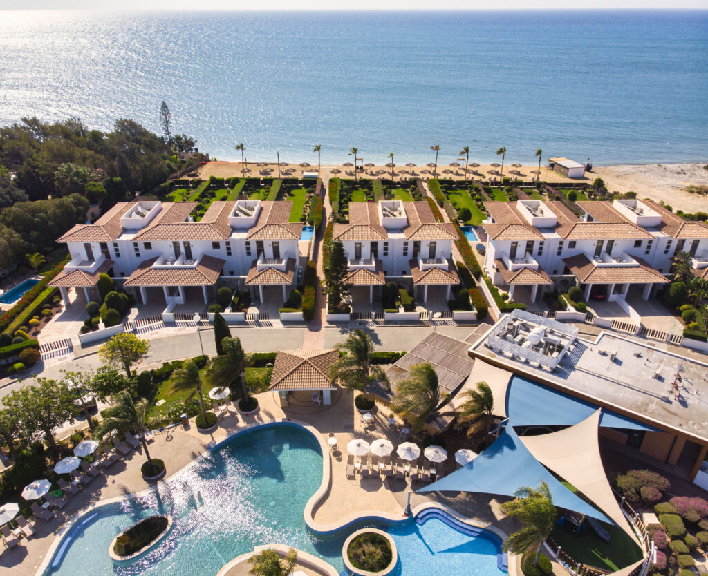 Atlantis Gardens features luxury and spacious self-catering Apartments & Villas with private pools & gardens. Located right up on the beach with magnificent direct views of the Mediterranean Sea our beautiful gem consists of an outdoor common swimming pool, a jacuzzi, a fitness center, landscaped gardens, a gated entrance and a beach with sunbeds and umbrellas. Wi-Fi and private covered parking spaces are also available free of charge.